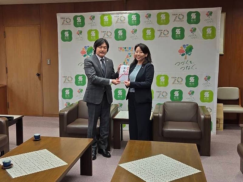 当クラブから、木村名誉顧問・橋本会長・泉会計の3名にて柏市役所秘書課へ訪問させていただき、太田和美柏市長との面談の後、支援金のお渡しをさせていただきました。福祉課から谷口部長、虻川課長にもご同席いただきました。
