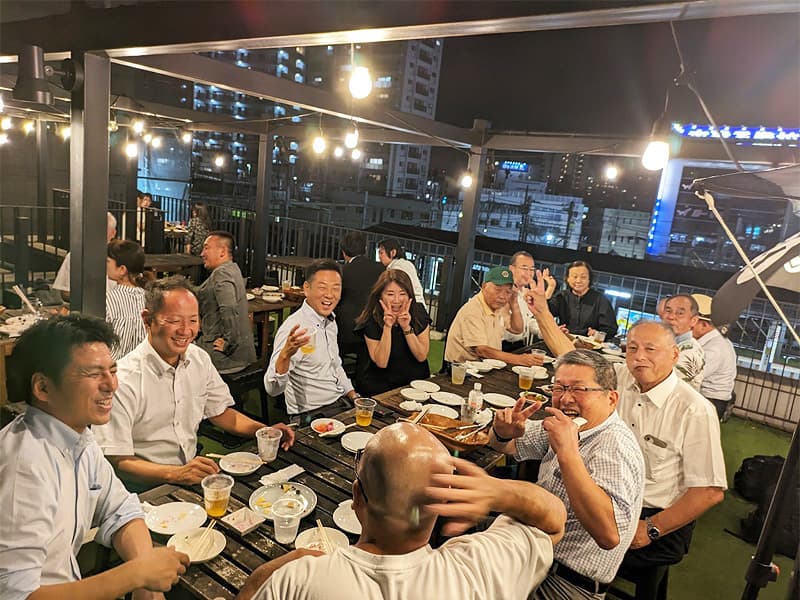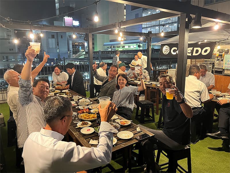 また、この日は懇親会として池松ビルに隣接するビアガーデンに場所を移し、納涼例会を久々に屋外で25名が参加して盛大に開催されました。