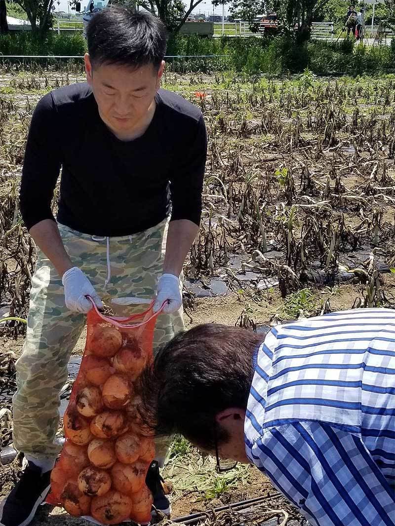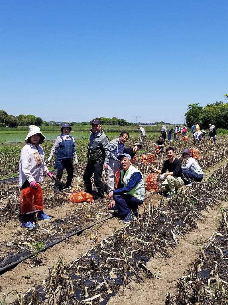 当クラブから14名にて白子ライオンズクラブ主催の白子のたまねぎ狩りに参加してまいりました。お天気にも恵まれ、気持ちよい青空の下での大きな白子のたまねぎを10Kg掘っては詰め掘っては詰めと笑顔と歓声の中で楽しい一時を過ごさせていただきました。