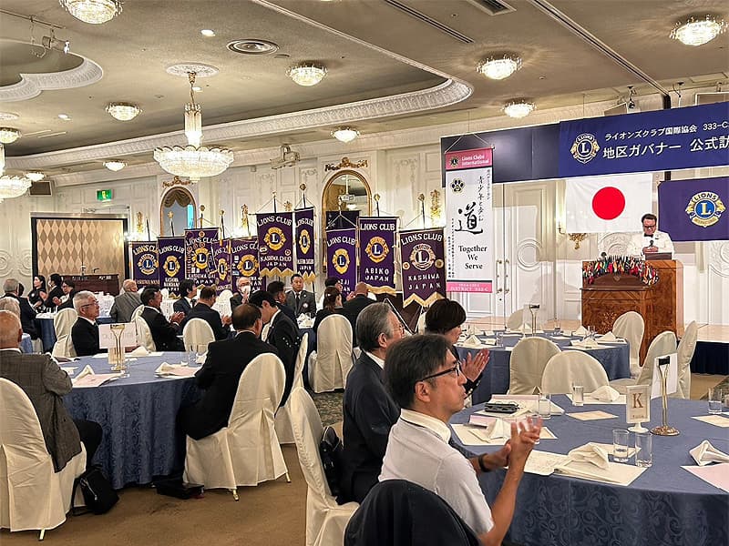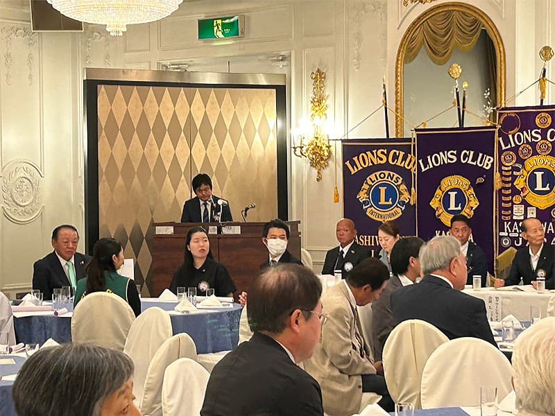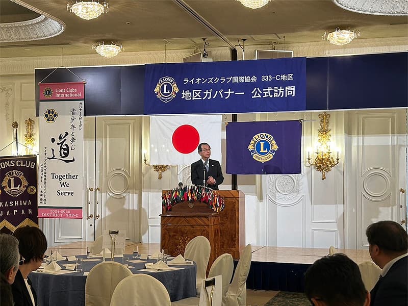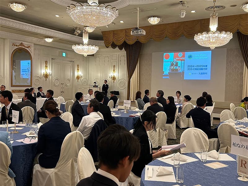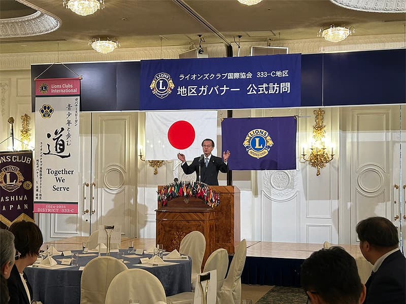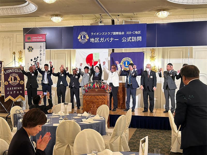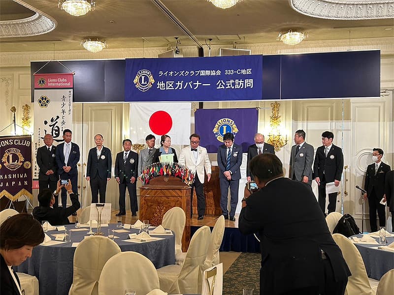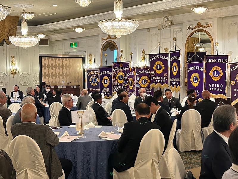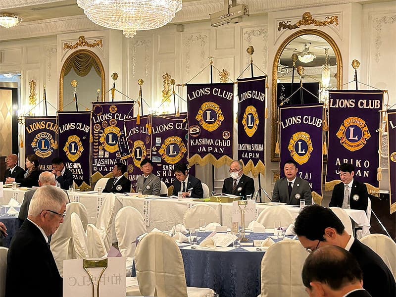 地区ガバナーを公式にお迎えしての合同例会がロイヤルガーデンパレス柏 日本閣にて盛大に開催されました。地区ガバナー・地区役員・ご来賓のご紹介から始まり、柏ライオンズクラブ、我孫子ライオンズクラブ、印西ライオンズクラブ、柏さくらライオンズクラブ、柏中央ライオンズクラブ、柏沼南ライオンズクラブ、柏グリーンライオンズクラブ、柏オークライオンズクラブ、柏なの花ライオンズクラブ、柏創生ライオンズクラブの会長ならびにクラブ紹介が行われ、地区ガバナーより地区運営方針の説明がありました。